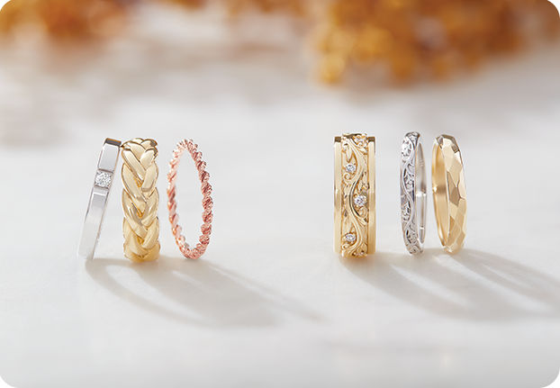 Two-tone bands, mixed metals, or unique textures like hammered or matte finishes are ideal for contemporary couples.