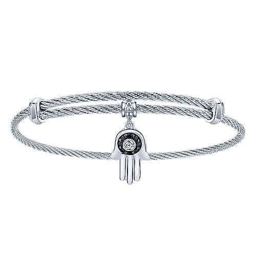 / STERLING SILVER & STAINLESS STEEL ADJUSTABLE BANGLE WITH BLACK SPINEL AND WHITE SAPPHIRE HAMSA CHARM